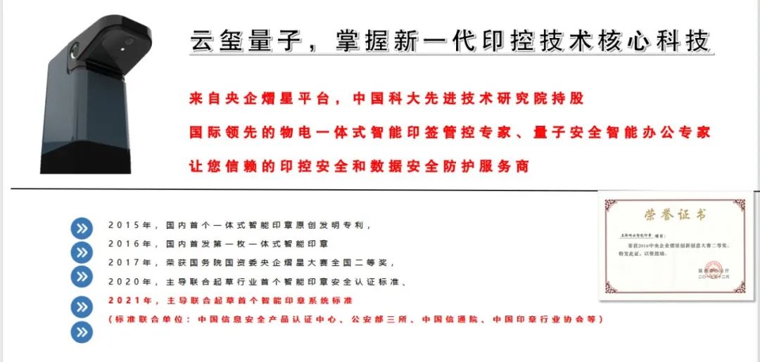 2020年,云璽量子聯合中國信息安全產品認證中心、公安部三所、信通院、中國印章行業協會,主導起草了行業首個智能印章安全標準和產品標準。標準的發布,大力推動了智能印章行業標準化、產業化發展。標志著千年傳統印章的智能化變革升級,進入智能印章時代。