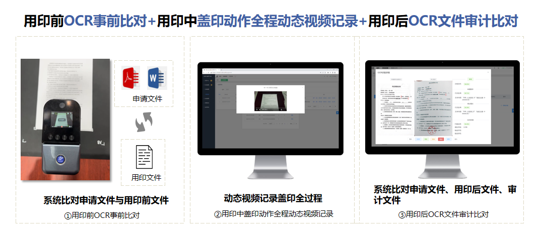 ③用印人通過指紋識別身份,攝像頭對用印文件內容與申請文件進行AI人工智能識別對比,如用印文件合法,智能印章自動解鎖,此時可按壓用印;