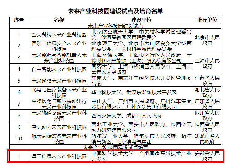11月28日,科技部、教育部發布《科技部教育部關于批復未來產業科技園建設試點的函》。批復未來產業科技園建設試點及培育名單,11家科技園入圍,其中依托中國科大和合肥高新區共建的量子信息未來產業科技園,成功獲批建設試點培育。