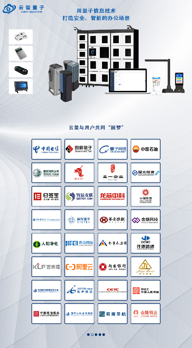 在信創 領域,云璽量子一直堅持貫徹國 家所確定的在科技創新層面的戰略目標,自2016年起開始布局科技創新辦公產品系列,致力于將自主可控量子安 全技術賦能企事業辦公,主營量子安 全智能辦公系統與終端、量子安 全智能印簽管理系統與終端。