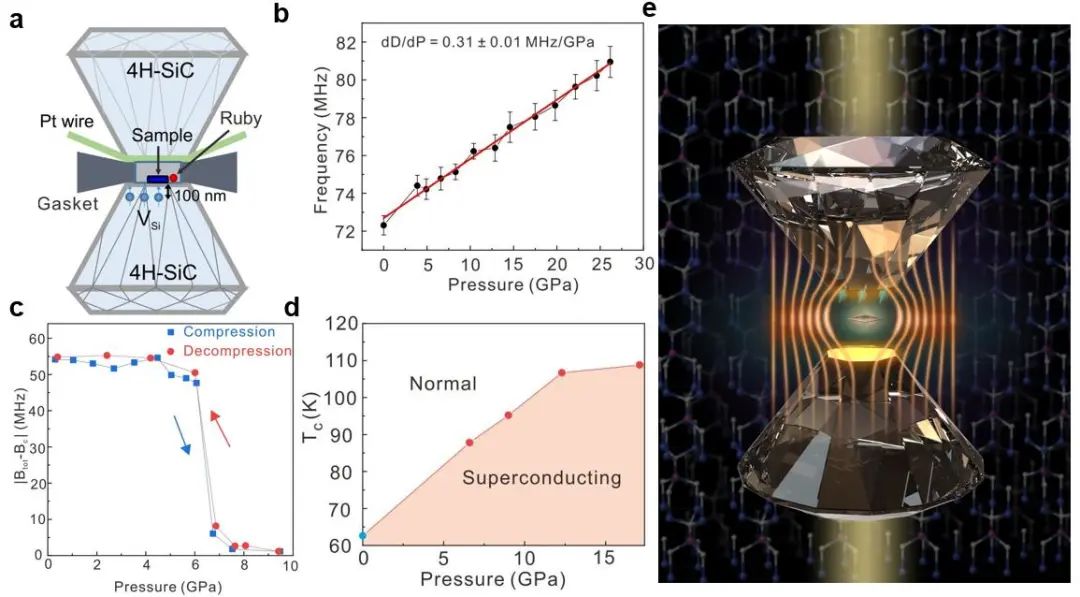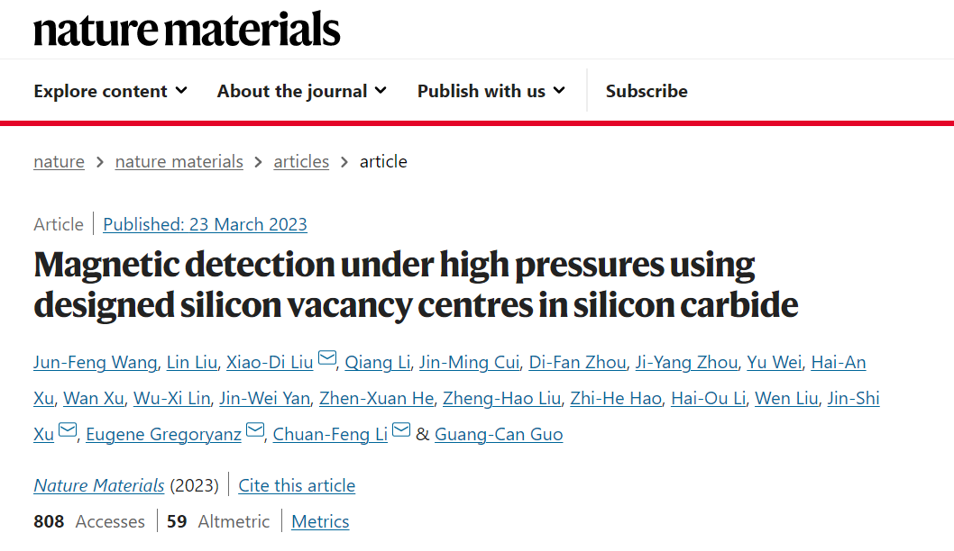 近期,依托中國科學技術大學組建的中科院量子信息與量子科技創新研究院郭光燦院士團隊在碳化硅色心高壓量子精密測量研究中取得重要進展。該團隊李傳鋒、許金時、王俊峰等人與中科院合肥物質科學研究院固體所高壓團隊劉曉迪研究員等合作,在國際上首次實現了基于碳化硅中硅空位色心的高壓原位磁探測,該技術在高壓量子精密測量領域具有重要意義。3月23日研究成果以“Magnetic detection under high pressures using designed silicon vacancy centres in silicon carbide” 為題在線發表在《自然·材料》雜志上 [Nature Materials (2023)]。