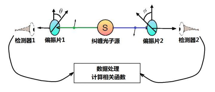 愛因斯坦構(gòu)想了一個(gè)思想實(shí)驗(yàn),描述了一個(gè)不穩(wěn)定的大粒子衰變成兩個(gè)小粒子(A和B)的情況:大粒子分裂成兩個(gè)同樣的小粒子。小粒子獲得動(dòng)能,分別向相反的兩個(gè)方向飛出去。如果粒子A的自旋為上,粒子B的自旋便一定是下,才能保持總體的自旋守恒,反之亦然。根據(jù)量子力學(xué)的說法,測量前兩個(gè)粒子應(yīng)該處于疊加態(tài),比如“A上B下”和“A下B上”各占一定概率的疊加態(tài)(例如,概率各為50%)。然后,我們對A進(jìn)行測量,A的狀態(tài)便在一瞬間坍縮了,如果A的狀態(tài)坍縮為上,因?yàn)槭睾愕木壒剩珺的狀態(tài)就一定為下。但是,假如A和B之間已經(jīng)相隔非常遙遠(yuǎn),比如說幾萬光年,按照量子力學(xué)的理論,B也應(yīng)該是上下各一半的概率,為什么它能夠在A坍縮的那一瞬間,做到總是選擇下呢?難道A和B之間有某種方式及時(shí)地“互通消息”?即使假設(shè)它們能夠互相感知,它們之間傳遞的信號(hào)需要在一瞬間跨越幾萬光年,這個(gè)傳遞速度已經(jīng)超過了光速,而這種超距作用又是現(xiàn)有的物理知識(shí)不容許的。于是,愛因斯坦認(rèn)為:這就構(gòu)成了佯謬。愛因斯坦強(qiáng)調(diào)不可能有超距作用,意味著他堅(jiān)持經(jīng)典理論的“局域性”。量子力學(xué)已經(jīng)否定了確定性,這是愛因斯坦不認(rèn)可的。而現(xiàn)在,如果連局域性都要拋棄,這可是愛因斯坦絕對不能同意的,因而在文章中他將兩個(gè)粒子間瞬時(shí)的相互作用稱為“幽靈般的超距作用”。薛定諤讀完EPR論文之后,他用德文寫了一封信給愛因斯坦,在這封信里,他最先使用了術(shù)語Verschr?nkung(意思是糾纏),這是為了要形容在EPR思想實(shí)驗(yàn)里,兩個(gè)暫時(shí)耦合的粒子,不再耦合之后彼此之間仍舊維持的關(guān)聯(lián)。EPR佯謬也得到了玻爾的回應(yīng)。他認(rèn)為,因?yàn)閮蓚€(gè)粒子形成了一個(gè)互相糾纏的整體,只有用波函數(shù)描述的整體才有意義,不能將它們視為相隔甚遠(yuǎn)的兩個(gè)個(gè)體——既然是協(xié)調(diào)相關(guān)的一體,它們之間便無須傳遞什么信息。愛因斯坦絕對接受不了玻爾的這種古怪的說法,即使在之后的二三十年中,玻爾的理論占了上風(fēng),量子理論如日中天,各個(gè)分支高速發(fā)展,給人類社會(huì)帶來偉大的技術(shù)革命,愛因斯坦仍然固執(zhí)地堅(jiān)持他的經(jīng)典信念,反對哥本哈根學(xué)派對量子理論的詮釋。1955年,愛因斯坦與世長辭,幾年后玻爾也離開了人世。但他們觀點(diǎn)的分歧依然沒有一個(gè)定論,直到1964年英國物理學(xué)家約翰·貝爾提出了著名的“貝爾不等式”。愛因斯坦一方堅(jiān)持認(rèn)為量子糾纏的隨機(jī)性是表面現(xiàn)象,背后可能藏有“隱變量”,貝爾本人也支持這個(gè)觀點(diǎn)。他試圖用實(shí)驗(yàn)來證明愛因斯坦的隱變量觀點(diǎn)是正確的。貝爾假設(shè)了一個(gè)上圖所示的實(shí)驗(yàn)。根據(jù)出生確定論,這些光子的偏振方向都是已經(jīng)確定好了的,對一個(gè)光子的測量結(jié)果和對另一個(gè)光子的測量結(jié)果無關(guān)。但在量子力學(xué)中,對一個(gè)光子的測量結(jié)果必然影響另一個(gè)光子的測量結(jié)果。比如做4次實(shí)驗(yàn),分別把左右兩邊的偏振片置于(0°, 0°)、(30°, 0°)、(0°, -30°)、(30°, -30°)的角度。第一種情況,所有的光子都能通過偏振片。第二、三種情況,是分別選擇每一邊的偏振片。第四種情況,是兩邊的偏振片都旋轉(zhuǎn)。簡單來說,如果對一個(gè)光子的測量結(jié)果和對另一個(gè)光子的測量結(jié)果無關(guān),那么兩邊的偏振片都旋轉(zhuǎn)的結(jié)果≤每一邊偏振片分別旋轉(zhuǎn)的結(jié)果之和,這就是貝爾不等式。但根據(jù)量子理論,對一個(gè)光子的測量結(jié)果必然影響另一個(gè)光子的測量結(jié)果。那么,就會(huì)出現(xiàn)兩邊的偏振片都旋轉(zhuǎn)的結(jié)果>每一邊偏振片分別旋轉(zhuǎn)的結(jié)果之和的情況。也就是說,如果該不等式成立,愛因斯坦獲勝,如果該不等式不成立,則玻爾獲勝。因此,貝爾不等式將愛因斯坦等人提出的EPR佯謬中的思想實(shí)驗(yàn),轉(zhuǎn)化為真實(shí)可行的物理實(shí)驗(yàn)。盡管貝爾的原意是支持愛因斯坦,找出量子系統(tǒng)中的隱變量,但他的不等式導(dǎo)致的實(shí)驗(yàn)結(jié)果卻適得其反。在之后的幾十年里,所有貝爾測試的實(shí)驗(yàn)結(jié)果都偏向于量子力學(xué)。1972年,物理學(xué)家克勞澤及其合作者弗里德曼,成為貝爾不等式實(shí)驗(yàn)驗(yàn)證的第一人。實(shí)驗(yàn)結(jié)果違背貝爾不等式,證明了量子力學(xué)的正確性。1982年,巴黎第十一大學(xué)的阿蘭·阿斯佩等人在貝爾的幫助下,改進(jìn)了克勞澤和弗里德曼的貝爾定理實(shí)驗(yàn),成功地堵住了部分主要漏洞。這次的實(shí)驗(yàn)結(jié)果同樣違反貝爾不等式,證明了量子力學(xué)的非局域性。