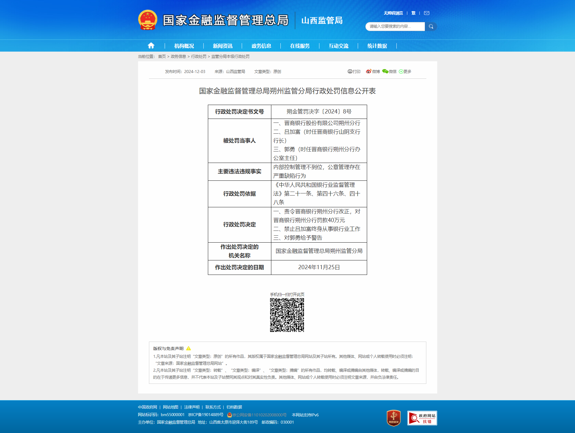 事件簡述:近日,國家金融監督管理總局朔州監管分局發布行政處罰信息,晉商銀行股份有限公司朔州分行因貸款“三查”制度執行不力,被處以20萬元罰款并要求整改。同時,該分行還因內部控制管理缺失及公章管理存在重大缺陷,再遭40萬元罰款及整改指令。國家金融監督管理總局朔州監管分局行政處罰信息公開表…