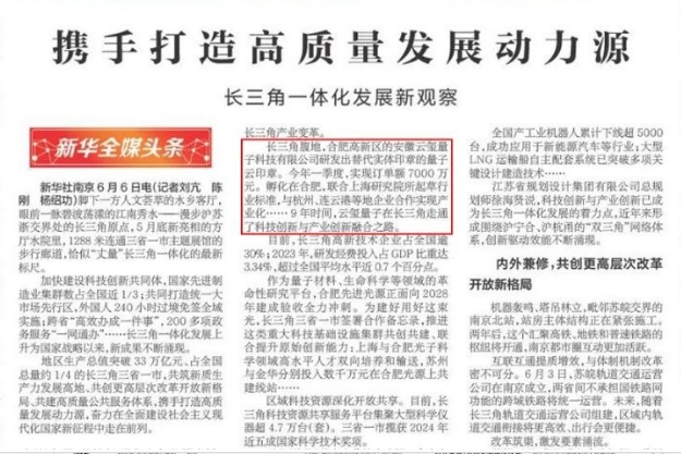 6月7日,新華社刊登的《攜手打造高質(zhì)量發(fā)展動(dòng)力源——長(zhǎng)三角一體化發(fā)展新觀察》文中,重點(diǎn)報(bào)道云璽量子走通長(zhǎng)三角科技創(chuàng)新、產(chǎn)業(yè)創(chuàng)新融合之路。云璽量子科創(chuàng)于合肥,目前在長(zhǎng)三角江、浙、滬等地,市場(chǎng)和產(chǎn)業(yè)化推進(jìn)迅速。憑借長(zhǎng)三角基礎(chǔ),向京津冀、珠三角和全國(guó)市場(chǎng)快速發(fā)展!原文如下:攜手打造高質(zhì)量發(fā)展…