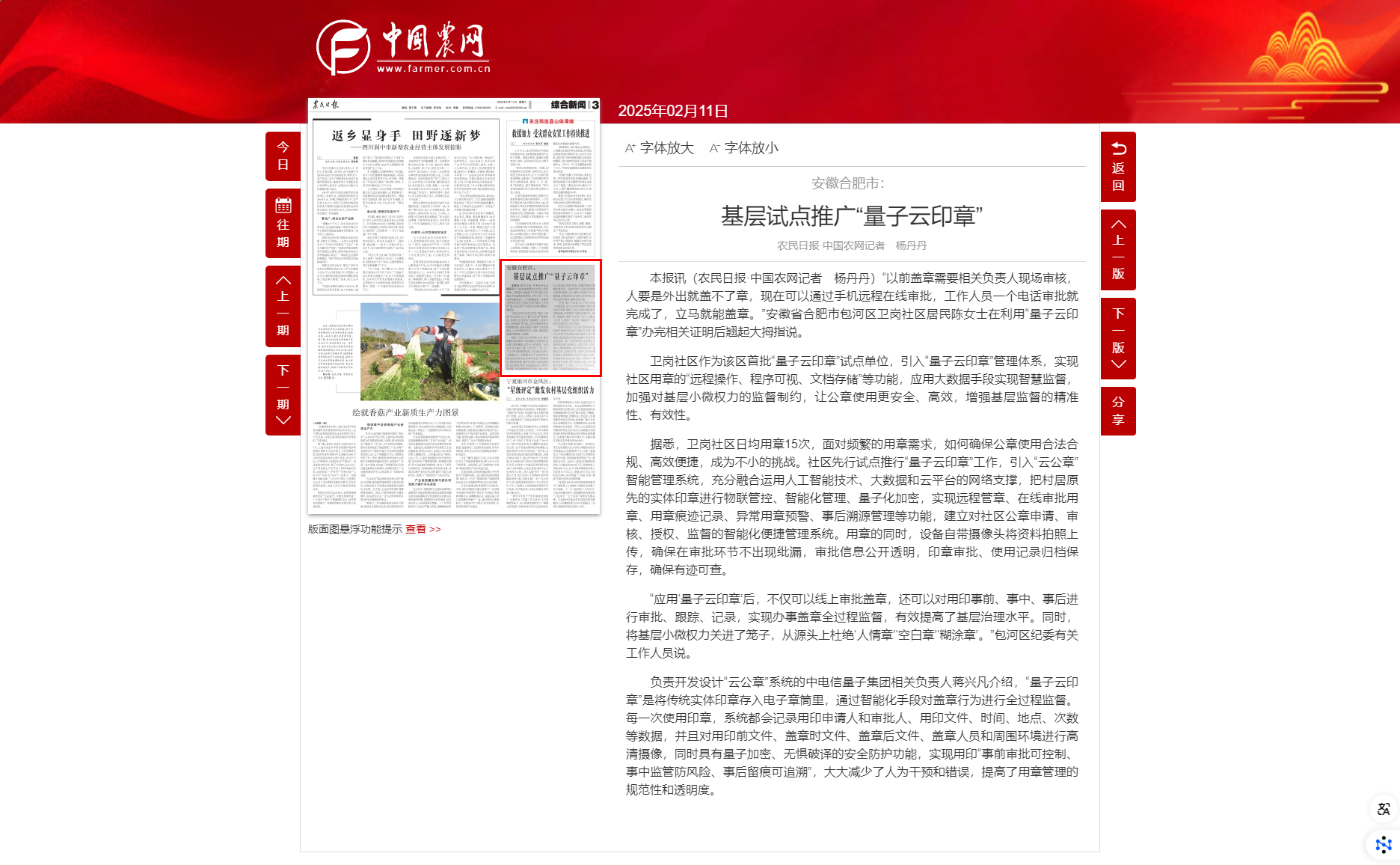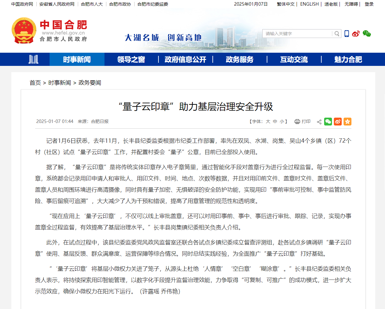 近期,安徽省合肥市長豐縣試點引入由中電信量子集團與云璽量子、科大國盾多年共同研發出的世界首款“量子云印章”,通過智能化手段對蓋章行為進行全過程監督,提高了用章管理的規范性和透明度,有效提升了基層治理水平。此舉受到了社會各界的廣泛關注,合肥市政府官方網站、合肥日報等多平臺對此進行了報道。…