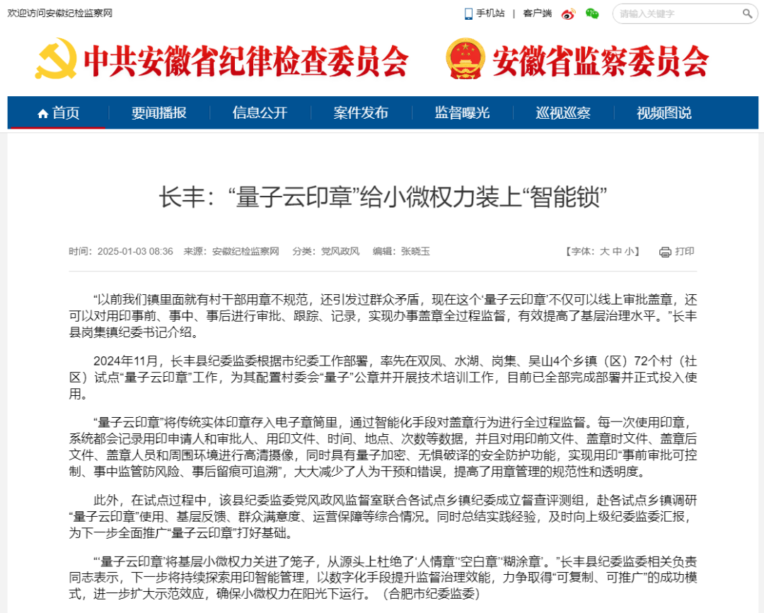 近日,安徽省合肥市長豐縣試點引入中電信量子集團與云璽量子、科大國盾多年共同研發出的“量子云印章”管理體系,構建了全新的村級印章管理模式,旨在實現基層治理和小微權力治理創新。此舉措引發了廣泛的關注,并得到了安徽紀檢監察網、合肥市紀委監委以及長豐縣紀檢監察網等多個官方平臺的報道。原文如下:…