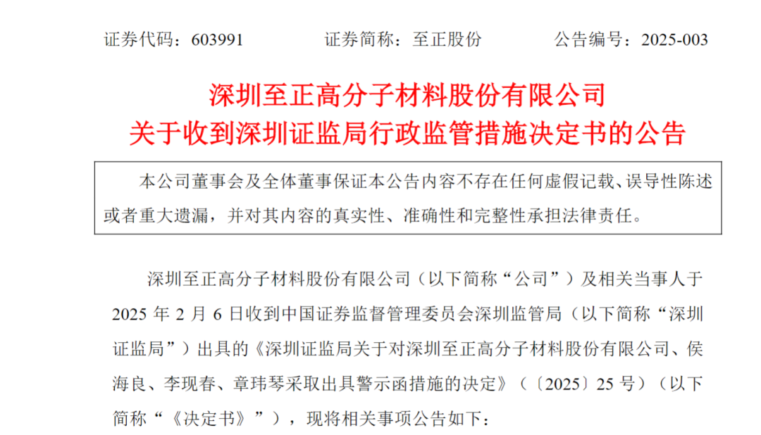 2月6日晚間,至正股份公告稱公司收到深圳監管局行政監管措施決定書,起因是公司原實際控制人及時任董事長侯海良違規擔保未履行相關信披義務和審批程序。事件回溯2020年4月,至正股份原董事長侯海良私自外借公司公章簽署違規擔保協議,導致企業卷入近千萬元債務糾紛。盡管事后達成和解,但該事件因未經…