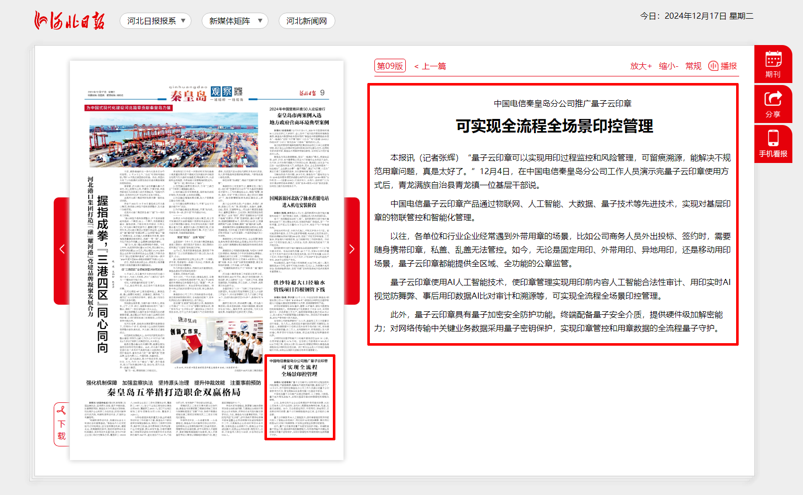 2024年12月17日,《河北日報》刊發特別報道《中國電信秦皇島分公司推廣量子云印章》,重點介紹了云璽量子與中電信量子集團、科大國盾多年共同研發出的量子+成果——“世界首款新一代一體式量子安全AI云智能印章”可實現全流程全場景印控管理。《河北日報》(2024年12月17日第09版)中國…