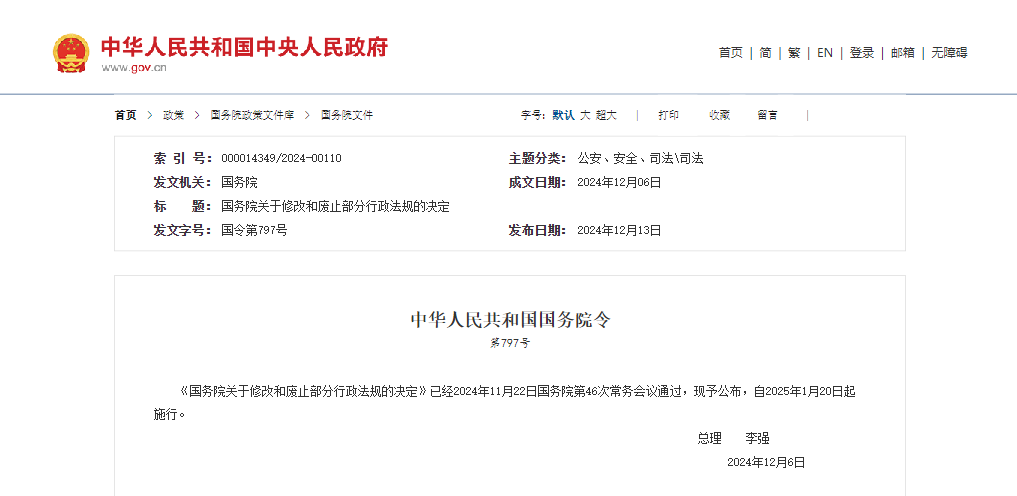 ·中華人民共和國國務院令第797號·《國務院關于修改和廢止部分行政法規的決定》已經2024年11月22日國務院第46次常務會議通過,現予公布,自2025年1月20日起施行。總理李強2024年12月6日國務院關于修改和廢止部分行政法規的決定為全面貫徹黨的二十大和二十屆二中、三中全會精神,…